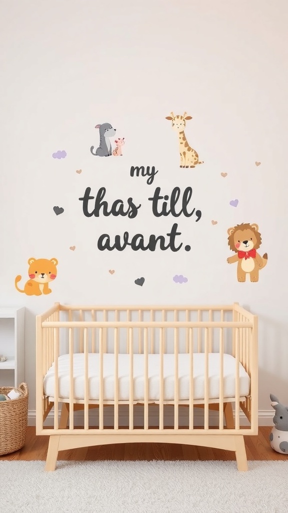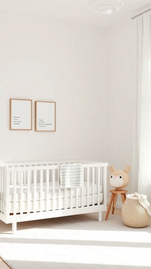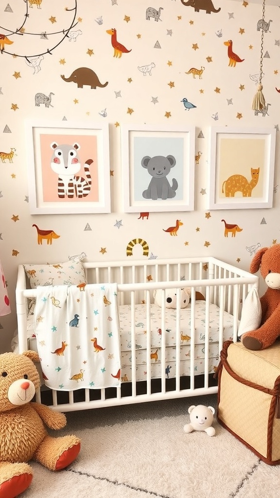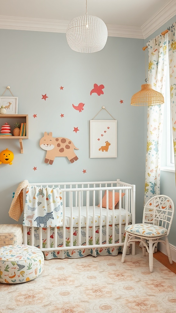 Wall decor featuring playful animals adds a touch of whimsy. A simple light fixture hangs above, providing soft illumination. The overall look is serene, perfect for creating a peaceful environment for your little one.