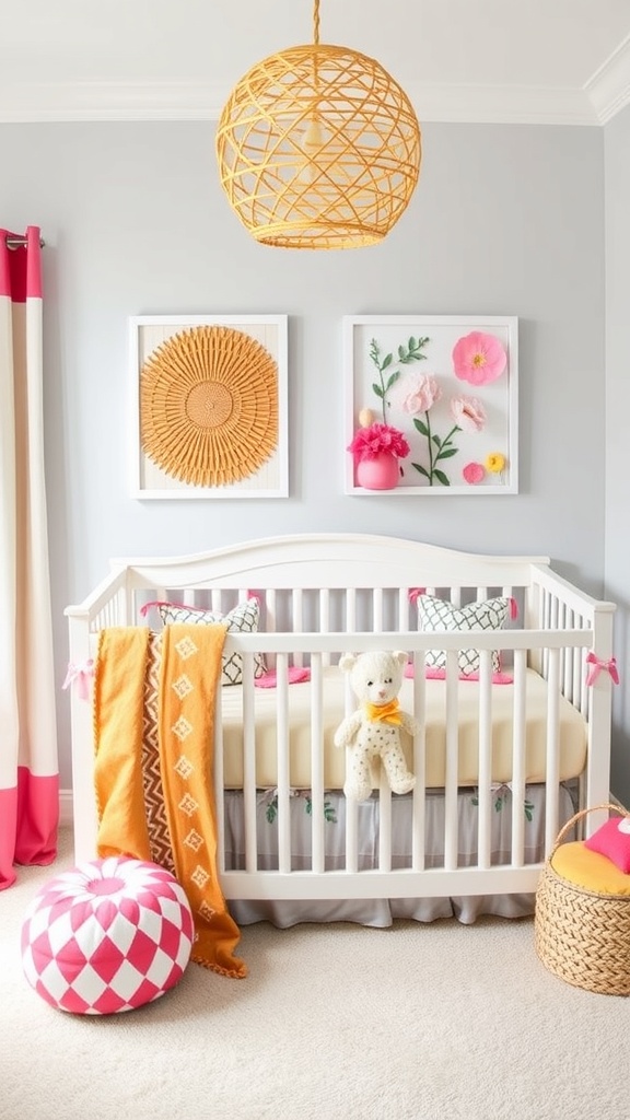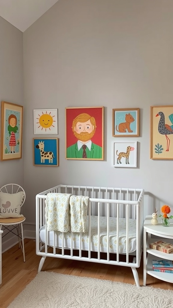 Creating a cheerful nursery for your baby girl can be a fun project. One great way to add personality is through colorful artwork. The image shows a lovely nursery with a variety of playful art pieces on the wall.