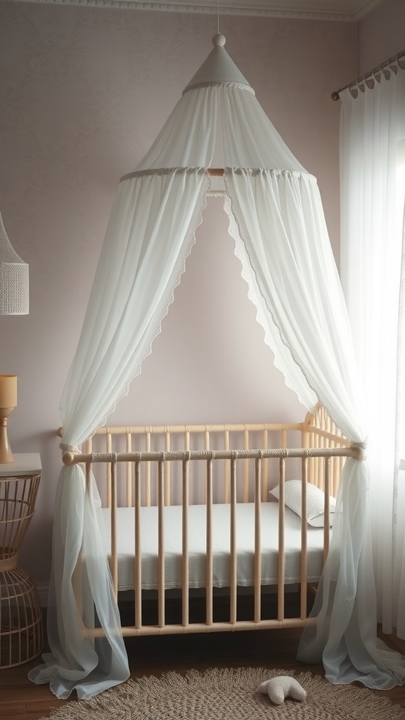 The light color of the canopy complements the gentle tones of the room, making it feel warm and welcoming. The simplicity of the crib’s design allows the canopy to shine, drawing attention without overwhelming the space.