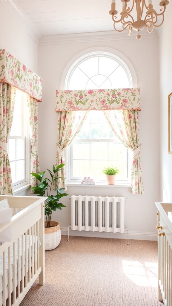 Window treatments can make a big difference in a nursery. They add style and help control light, creating a cozy space for your little one. In the image, you can see beautiful floral curtains that bring a touch of charm to the room.