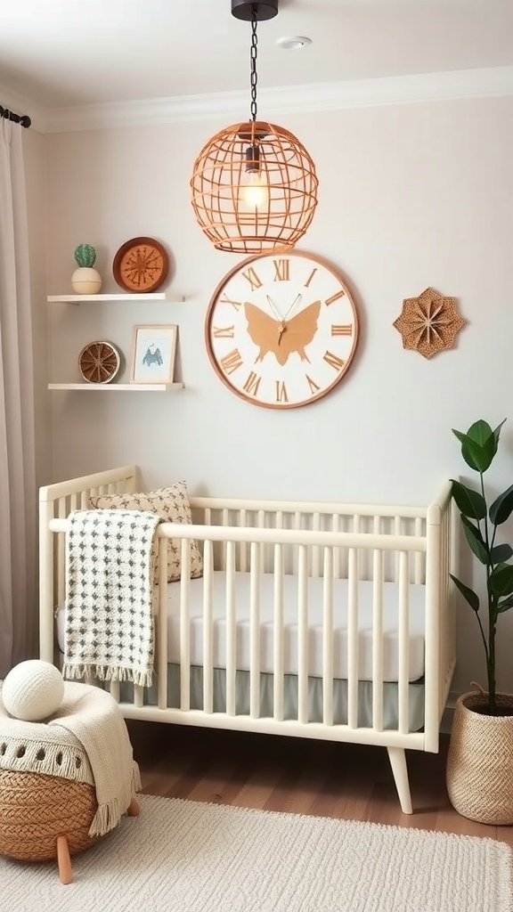 The wall decor features natural elements, such as woven hangings and small planters. These details add character and charm, making the nursery feel unique. The soft, earthy tones complement the overall theme, creating a serene environment.