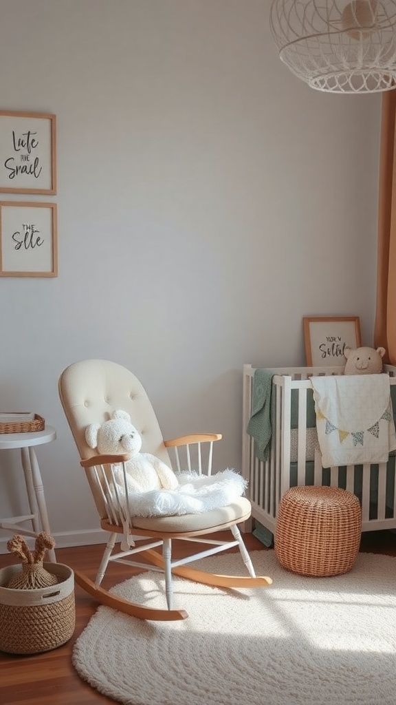 With a plush teddy bear resting on the chair, it adds a touch of warmth and comfort. The gentle rocking motion can help calm both baby and parent during those late-night feedings or quiet moments. The neutral tones of the chair blend beautifully with the nursery’s decor, making it a stylish addition.