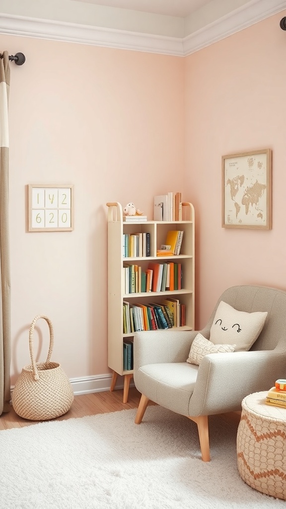 The light pink walls create a warm and inviting atmosphere. A small bookshelf filled with colorful books adds a playful touch. It’s great to have a mix of classic tales and modern favorites to spark imagination.