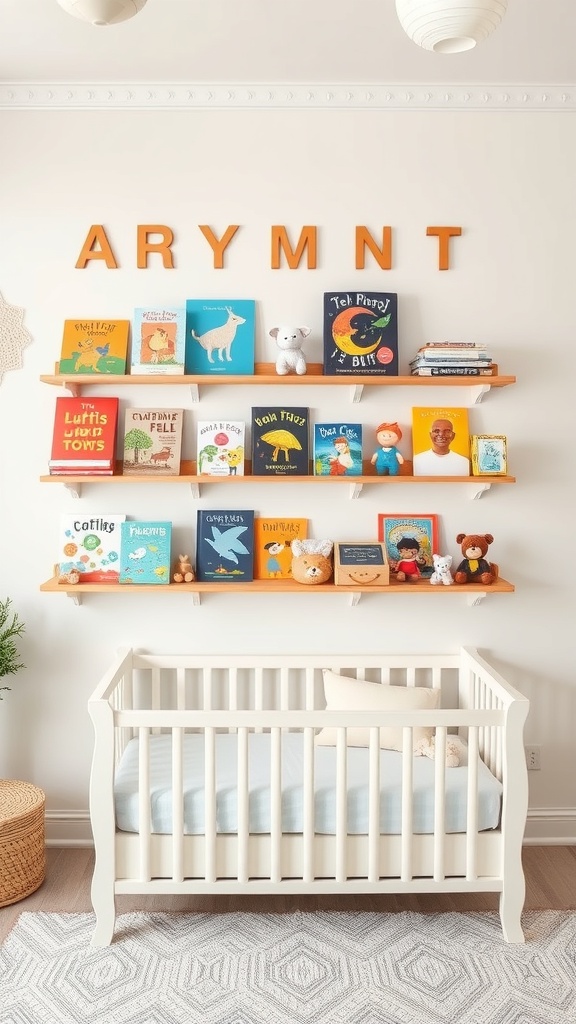 Wall shelving can transform a nursery into a playful and organized space. In the image, you see a lovely setup that showcases colorful books and soft toys on wooden shelves. This not only adds charm but also makes it easy to access books for storytime.