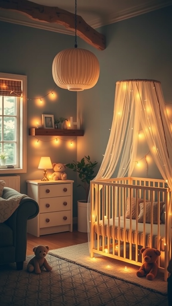 String lights can transform a nursery into a cozy haven. In the image, soft, twinkling lights are draped around the crib and walls, creating a warm glow. This gentle lighting is perfect for late-night feedings or soothing your little one to sleep.