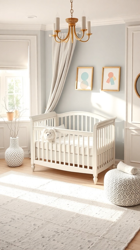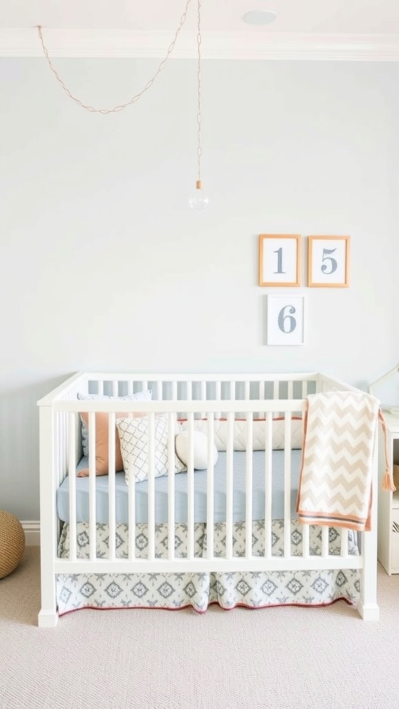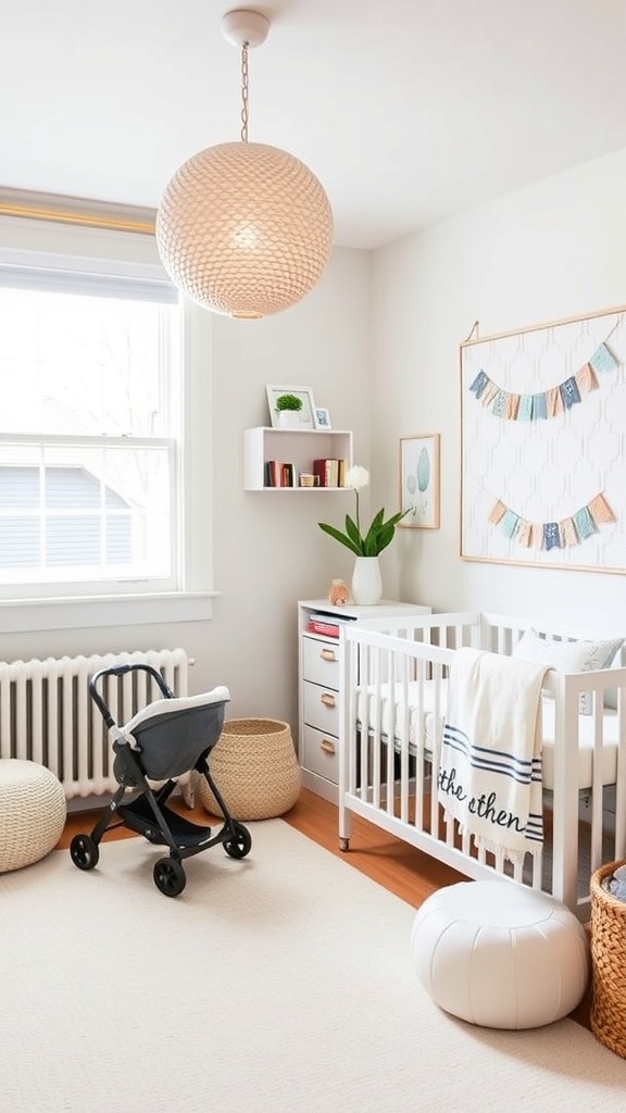 Surrounding the crib, the decor enhances the overall look. The light fixture above casts a warm glow, while the artwork on the walls adds a splash of color without overwhelming the space. The soft rug underfoot provides a comfortable area for playtime, making this nursery both practical and stylish.