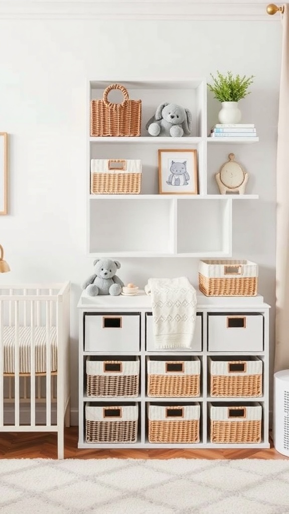 The wall-mounted shelf is a great way to display cute items while keeping them within reach. Baskets on the shelf and on the floor provide ample space for toys and blankets, making it easy to grab what you need during playtime or bedtime. This setup encourages a clutter-free environment, which is essential for a calming nursery.