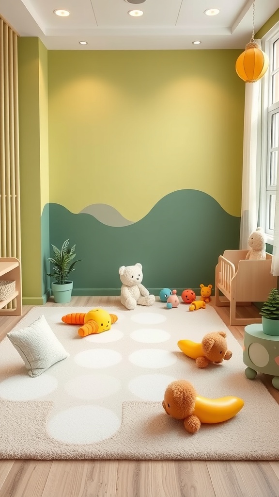 Don’t forget to include storage solutions for toys. A simple shelf or basket keeps the area tidy and teaches her about organization early on. Overall, this interactive play area is designed to inspire creativity and movement, making it a delightful part of her nursery.