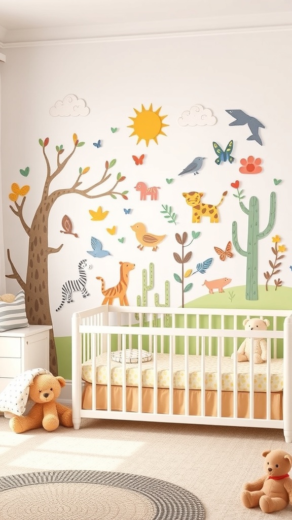 Interactive wall art can truly transform a nursery into a lively space. The image showcases a charming design featuring playful animals, trees, and colorful elements that spark imagination. This type of art not only beautifies the room but also engages your little one.