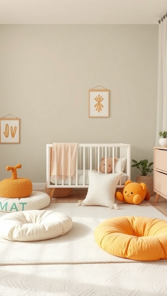 Floor cushions are a fun and cozy addition to any baby girl’s nursery. They create a welcoming space for playtime and relaxation. The image showcases a bright and cheerful setup, featuring cushions in soft colors like orange and cream. These cushions invite little ones to sit, crawl, or lounge comfortably.