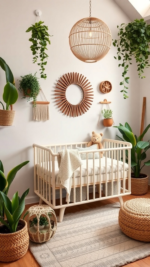 Creating a nature-inspired nursery is a wonderful way to bring the outdoors inside. The image showcases a cozy space filled with plants, natural textures, and soft colors. The wooden crib stands out, inviting warmth and comfort.