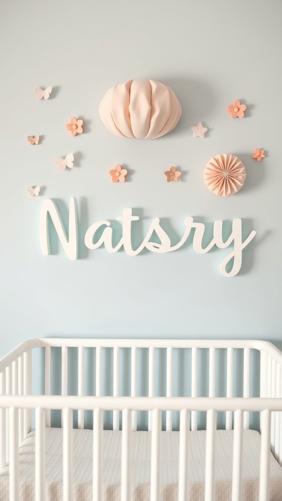 Personalized name decor adds a special touch to any nursery. In the image, we see a lovely setup featuring the name ‘Natsry’ in playful, colorful letters. The soft pink and warm orange hues create a cheerful vibe, making the space feel inviting and unique.