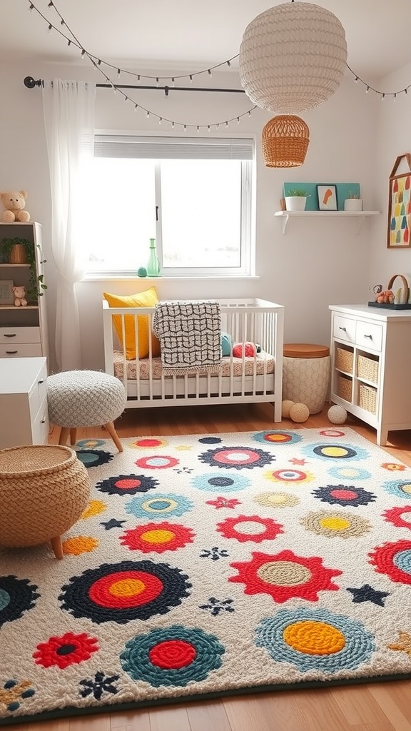 A playful rug can truly bring a nursery to life. The image shows a vibrant rug filled with colorful flowers and circles, perfect for a baby girl’s room. This design adds a cheerful touch, making the space feel warm and inviting.