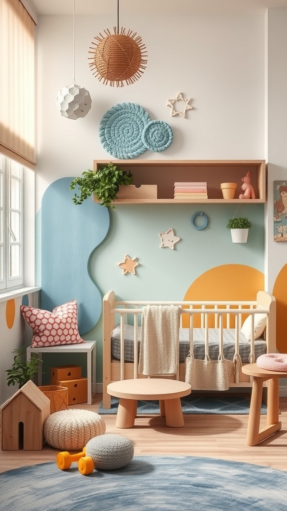 Colorful wall decorations, like the blue and orange shapes, not only brighten the room but also help with visual stimulation. Babies are naturally drawn to bright colors, which can spark their curiosity and encourage them to reach out and explore.
