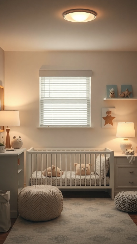 Incorporating lamps with soft shades can also enhance the lighting. They can be placed on nightstands or shelves, providing just the right amount of light for reading bedtime stories. A cozy rug and plush toys add to the comforting feel, making the nursery a perfect retreat for your little one.