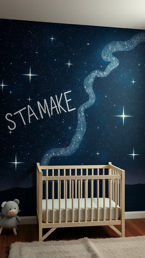 Creating a nursery with a starry night sky mural can be a magical experience. The deep blue backdrop sprinkled with twinkling stars instantly transforms the room into a dreamy space. This design can inspire a sense of wonder and calm, perfect for your little one’s sleep environment.