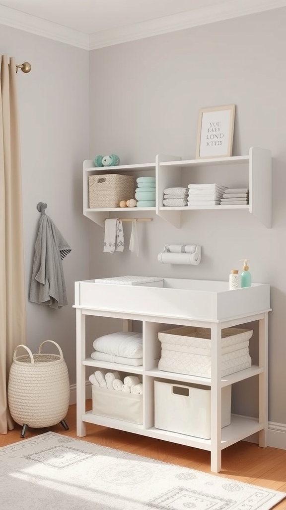 A stylish diaper changing station can make a big difference in your nursery. This image shows a clean, modern setup that combines functionality with aesthetics. The changing table features a sleek white finish, which brightens up the space and keeps it feeling fresh.