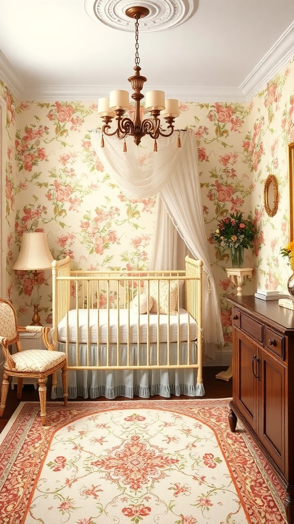 In the image, you can see a lovely crib surrounded by beautiful floral wallpaper. This kind of wallpaper adds a touch of nostalgia and warmth. The light colors and delicate designs make the space feel inviting.