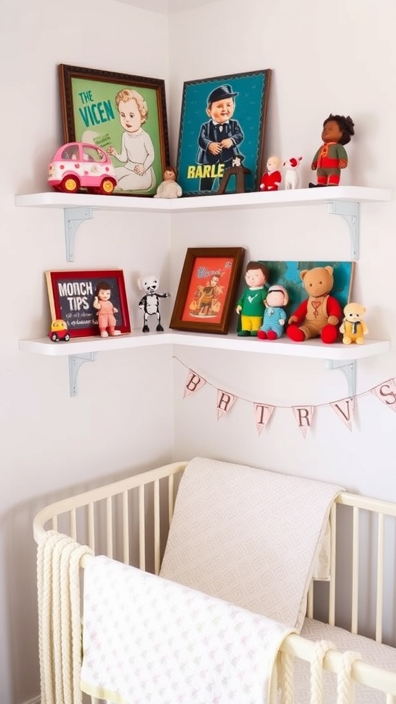 Creating a vintage toy display in your baby girl’s nursery can add a charming touch. The image showcases a lovely arrangement of classic toys and decor. Shelves filled with colorful toys like cars, dolls, and playful figurines bring a sense of nostalgia.