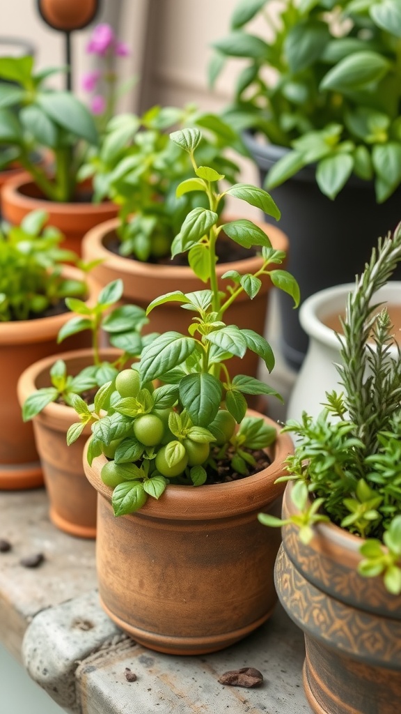 Creating a herb garden in your backyard is a fun and practical way to enhance your culinary experience. Just imagine stepping outside to grab fresh basil or mint for your dish. The image shows an array of herbs in charming pots, ready to be snipped and used in your favorite recipes.