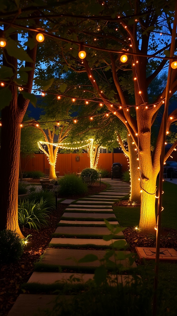 Lighting can truly transform a backyard. Imagine walking down a charming path illuminated by soft, warm lights. This inviting scene showcases how decorative garden lighting can enhance the natural beauty of your outdoor space.