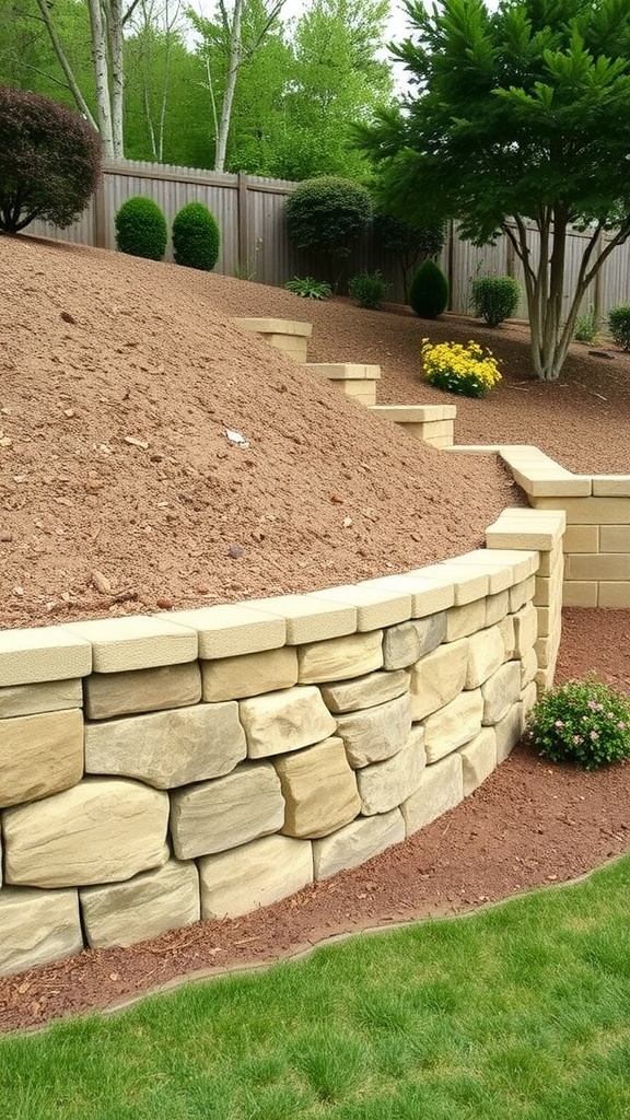 The use of stone creates a warm, earthy feel. Its texture and color blend well with the surrounding greenery. You can see the careful placement of each stone, giving it a rustic charm. This design not only holds back soil but also enhances visual interest in the yard.