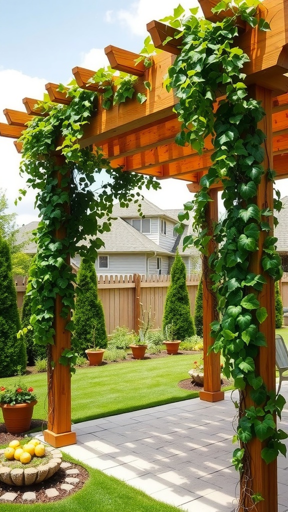 A pergola can transform your backyard into a cozy retreat. It provides shade while allowing you to enjoy the outdoors. In the image, we see a beautifully crafted pergola adorned with lush green vines. The open design allows sunlight to filter through, creating a pleasant atmosphere.