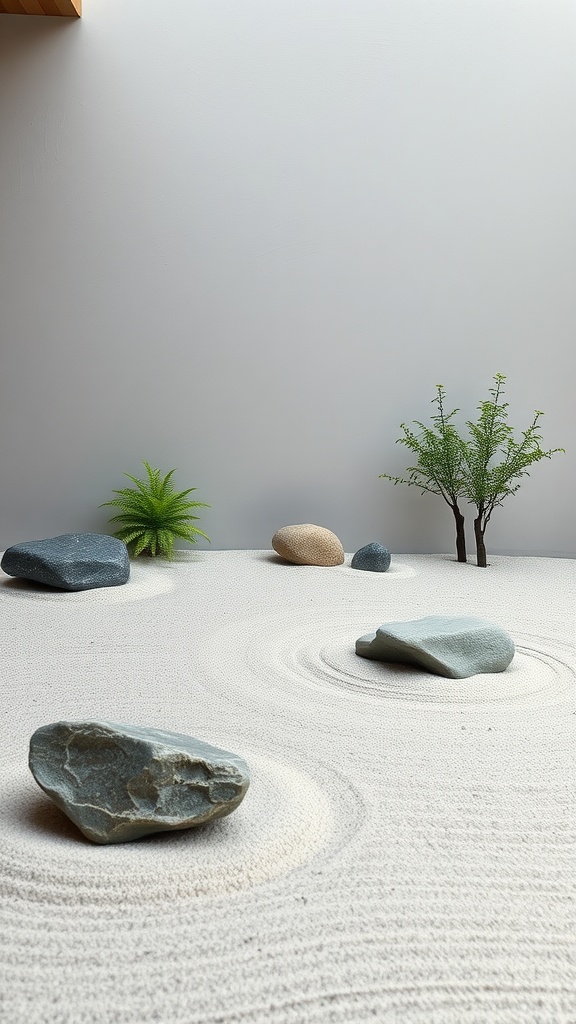A modern Zen garden can be a serene retreat right in your backyard. The image showcases a simple yet effective design featuring smooth stones, soft sand, and minimal greenery. This combination creates a peaceful atmosphere that invites relaxation.