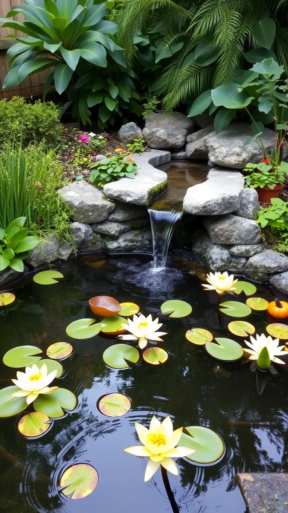 Creating a serene water feature in your backyard can transform your outdoor space into a peaceful retreat. The image beautifully illustrates a lovely pond surrounded by lush greenery and blooming water lilies. This charming scene invites relaxation and tranquility.