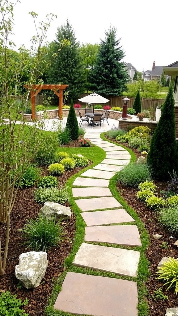 Creating pathways in your backyard is more than just a design choice; it’s about making your outdoor space inviting and accessible. The image shows a lovely stone path that winds through a well-kept garden. This kind of pathway adds charm while ensuring everyone can enjoy the area.