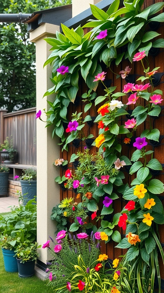 Vertical gardening is a fantastic way to add beauty and greenery to your backyard, especially in smaller spaces. The image showcases a stunning vertical garden bursting with vibrant colors. Striking purple flowers, along with bright red and orange blooms, create a striking display against a neutral wall. This lively arrangement not only enhances the visual appeal but also maximizes the use of limited planting areas.