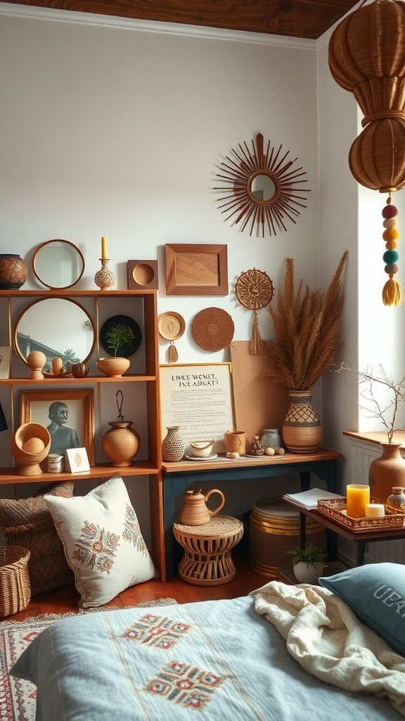 In a boho bedroom, artisan crafted accessories play a vital role in creating a warm and inviting space. The image showcases a beautifully arranged wall filled with unique pieces that capture the essence of handmade artistry.