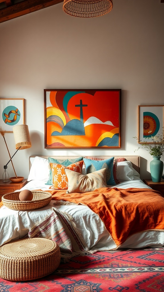 In a boho bedroom, bright and bold accents create an inviting atmosphere that feels both cozy and vibrant. The combination of colors and textures is key to achieving that relaxed, yet stylish vibe.