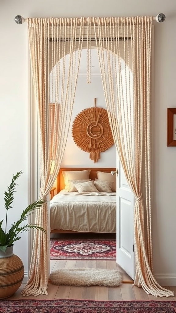Beaded curtains are a fun and stylish addition to any boho bedroom. In the image, you can see a lovely set of soft, cream-colored beaded curtains that beautifully frame an entrance. They create a warm and inviting atmosphere while also providing a touch of privacy.