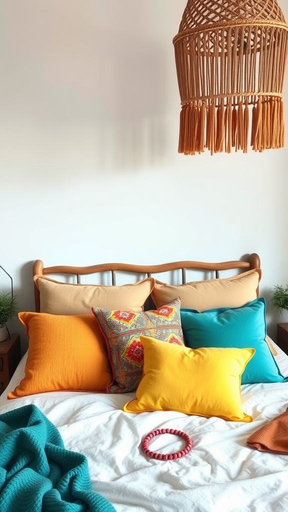 The arrangement of throw pillows in a boho bedroom can truly make the space feel inviting and cozy. In the image, we see a vibrant mix of colors that instantly catches the eye. Each pillow adds its own unique touch, creating a playful yet harmonious vibe.