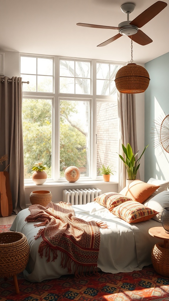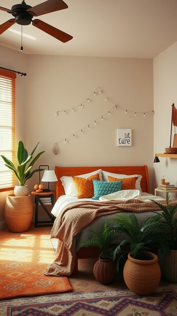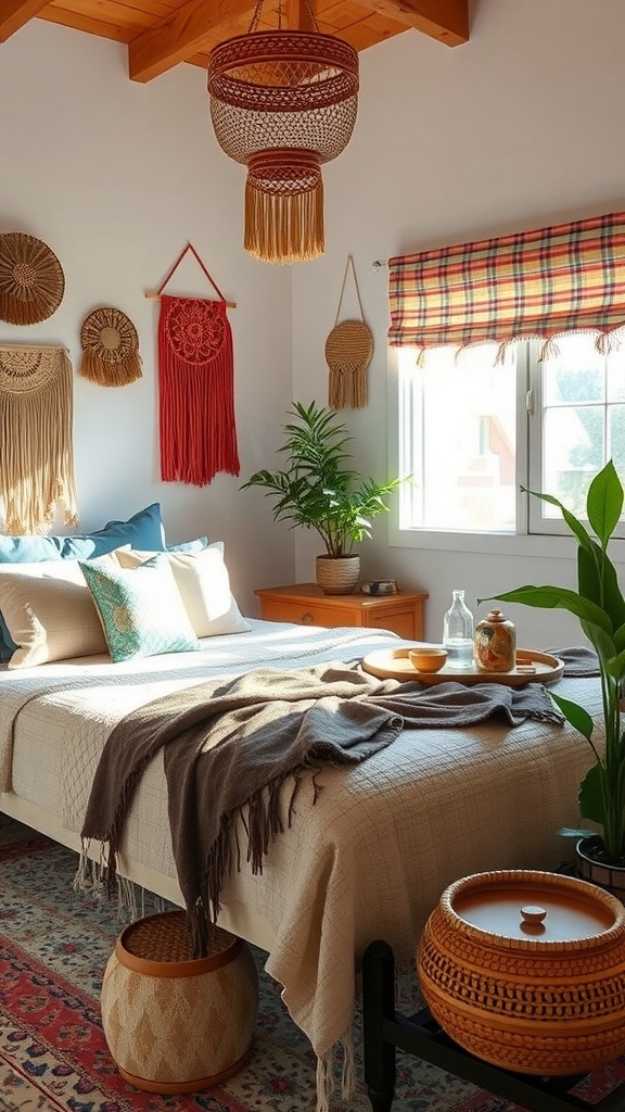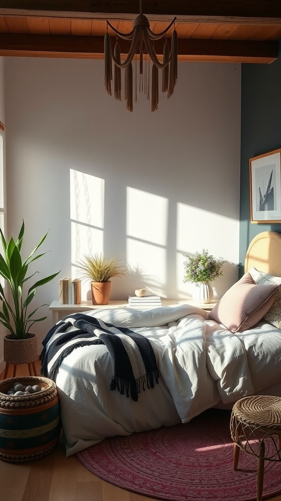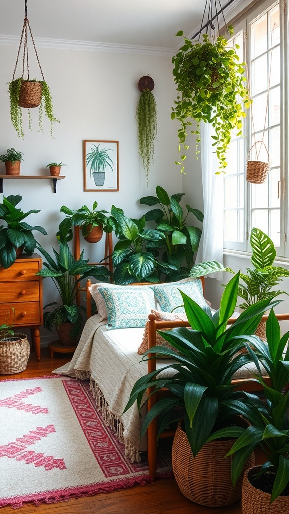 Indoor plants not only enhance the aesthetic of a boho bedroom but also contribute to better air quality. In the image, you can see a lovely mix of greenery that breathes life into the space. The hanging plants add a whimsical touch while saving floor space, making them ideal for smaller rooms.