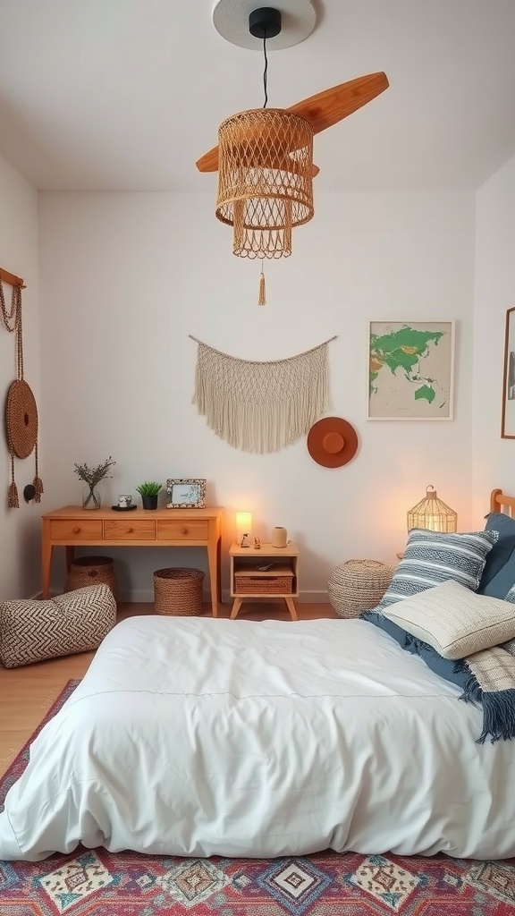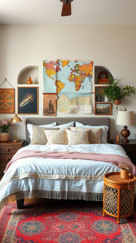 Your boho bedroom can easily reflect your love for travel through unique decor pieces. In the image, a world map takes center stage above the bed, reminding us of the adventures waiting beyond our doorstep.