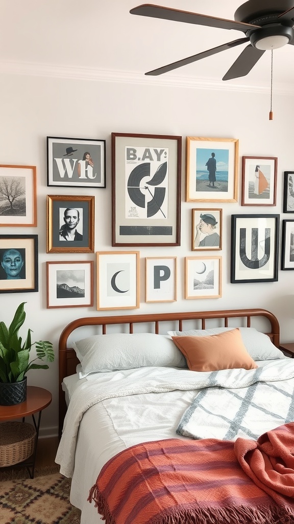 When you step into a boho bedroom, one of the first things that catches your eye is the collection of personal pictures on the wall. This space showcases a lovely gallery of framed photographs that tell a story. Each image adds character to the room, making it feel inviting and warm.