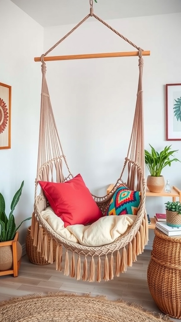 In the image, you can see a hammock chair suspended from the ceiling, providing the perfect spot for relaxation. Its design invites you to curl up with a good book or simply enjoy some quiet time. The warm neutral tones of the chair complement the vibrant throw pillows, creating an inviting atmosphere.