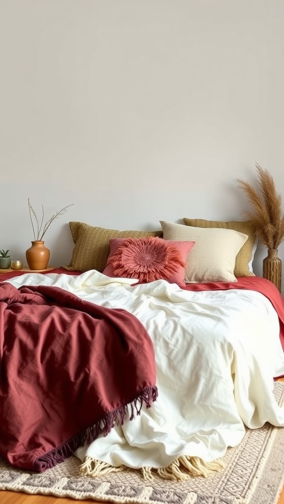 Layering your bedding is a fantastic way to add depth and warmth to your boho bedroom. In the image, we see a bed dressed in a mix of earthy tones and textures that truly captures a laid-back vibe.
