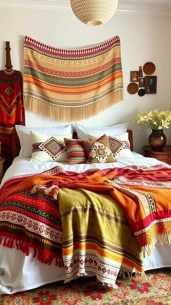 The vibrant throw blanket drapes over the bed, featuring rich colors and intricate designs. It invites you to snuggle in, making the space feel cozy and personal. Soft pillows in various sizes provide support and style, encouraging you to relax and unwind.