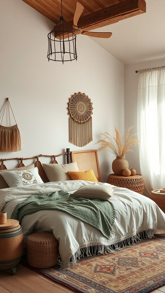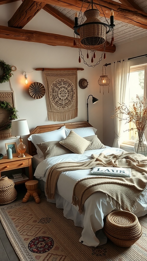 Transforming your boho bedroom with seasonal decorations can breathe new life into your space. The image showcases a cozy, inviting bedroom that perfectly captures the essence of bohemian style. The natural materials and warm colors create a relaxed atmosphere, making it the perfect backdrop for seasonal updates.