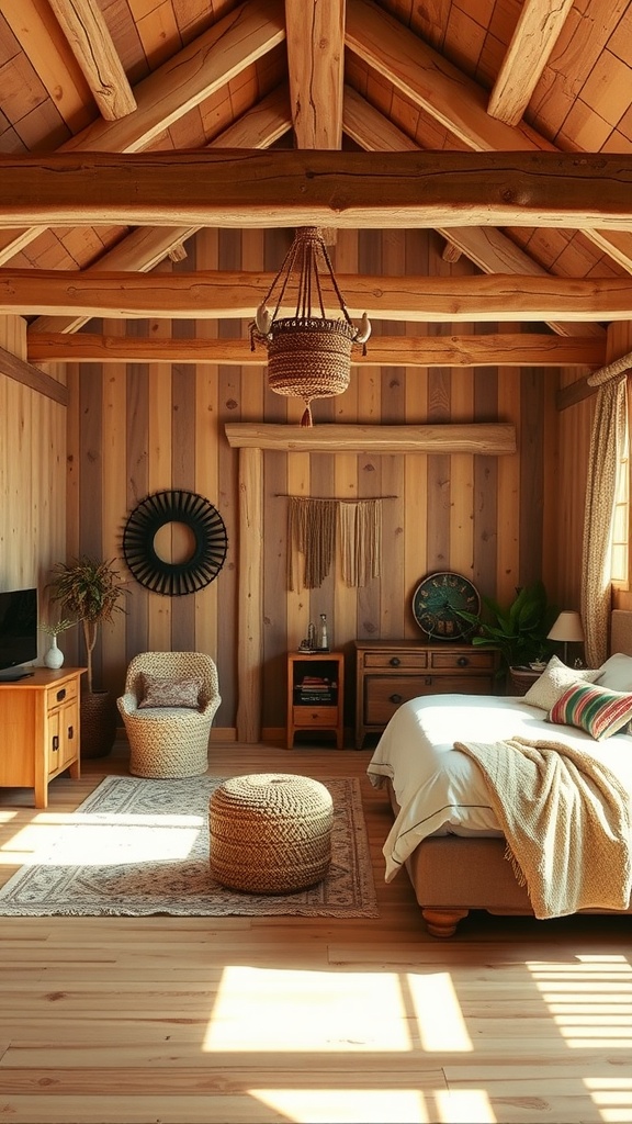 The exposed beams and wooden furniture create a rustic charm. The light wood flooring enhances the room’s openness and brightness, making it feel airy and spacious. Incorporating natural materials helps to form a cozy retreat, encouraging relaxation.