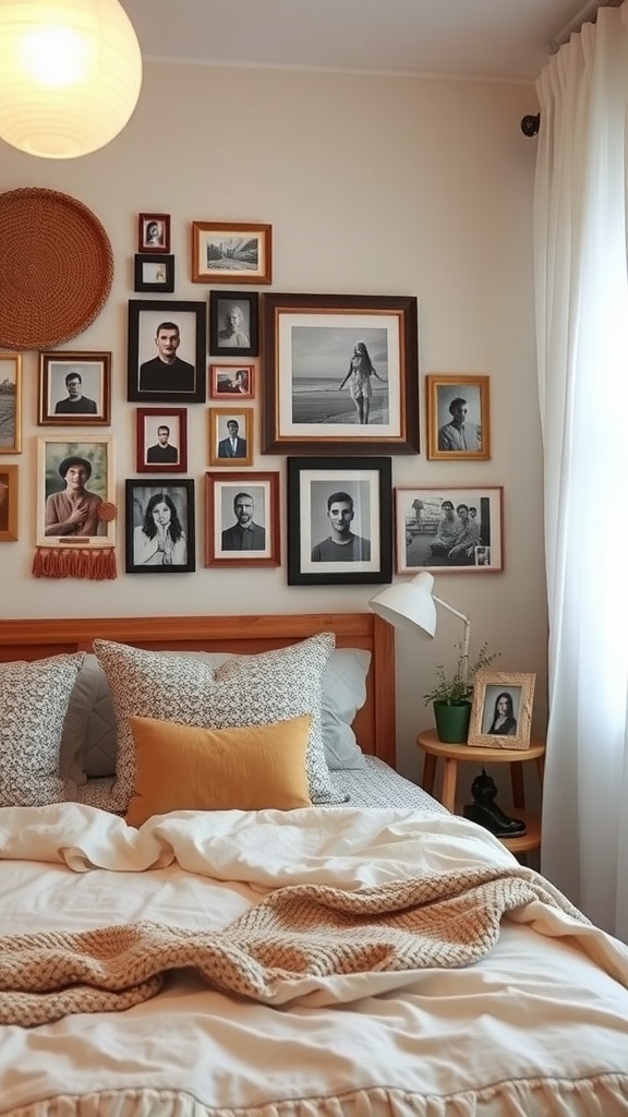 Complementing the visual appeal, the bohemian aesthetic is enhanced by the soft textures in the bedding and pillows on the bed. The earthy tones and patterns create a cohesive look that invites relaxation. This combination of personal images and cozy decor makes the room feel like a retreat.