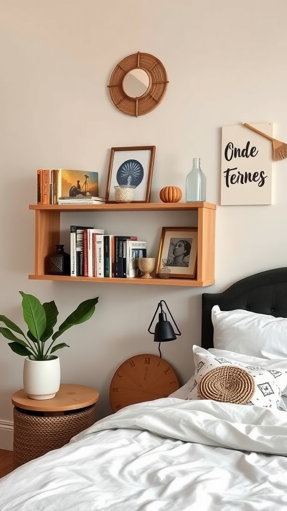 Boho bedrooms thrive on personal touches, and wall shelves are a fantastic way to showcase your unique style. In this image, you can see how the warm wood of the shelves complements the gentle colors of the room. The shelves are filled with a mix of books, art, and decorative items that tell a story. Placing your favorite reads alongside personal photos or small plants can really bring a cozy feel to your space.