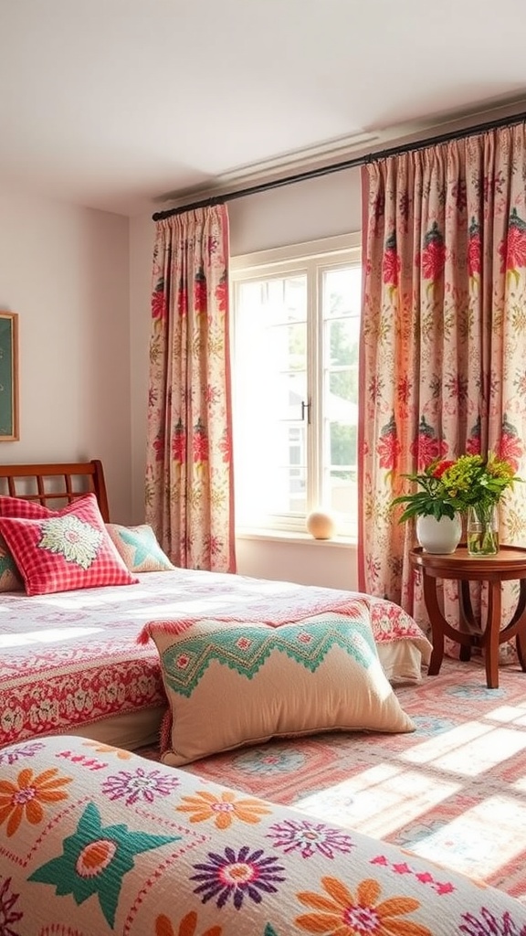 The bedding, adorned with bright flowers and geometric shapes, catches the eye immediately. It’s a mix of colors that dance together, adding a touch of whimsy to the room. Complementing this, the curtains with their delicate floral embroidery let in soft, natural light while preserving privacy.