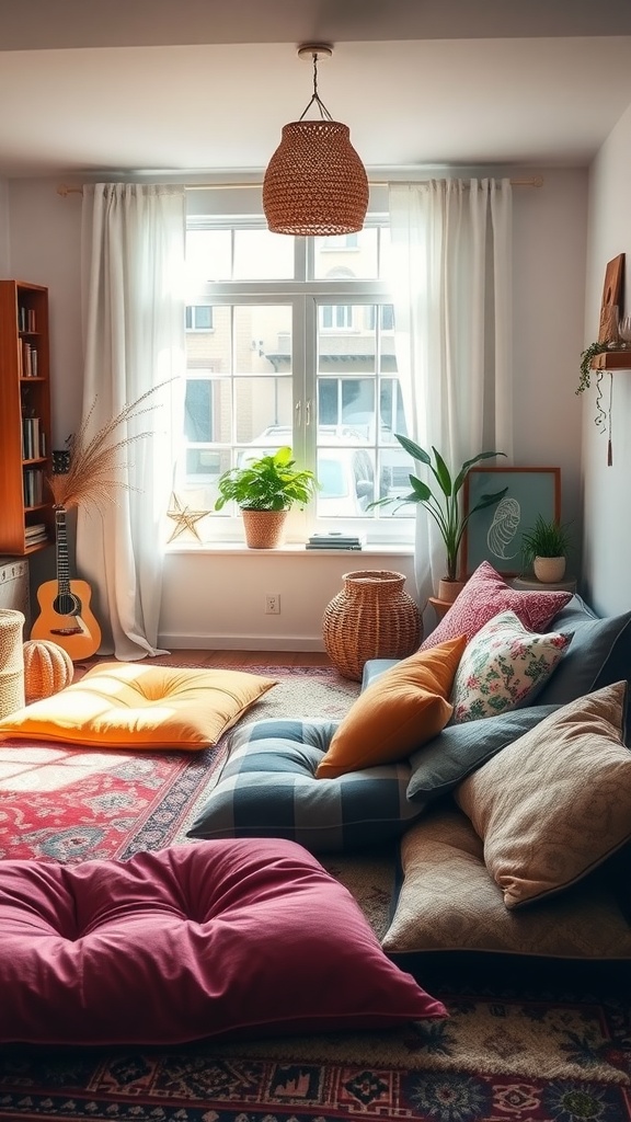 Nearby, a guitar leans casually against the wall, hinting at a creative vibe that encourages you to take a moment and strum a few chords. The layered rugs beneath the cushions add warmth and depth to the space, making it feel inviting and homely.