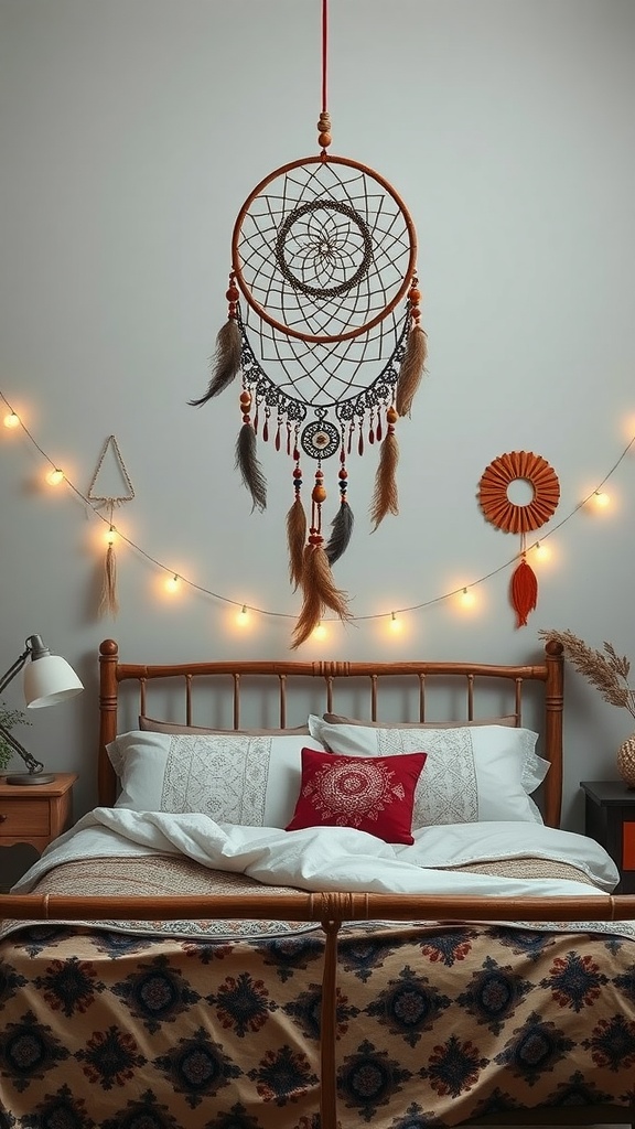 Dreamcatchers are a classic choice for boho bedrooms, serving both aesthetic and symbolic purposes. In the image, a beautifully crafted dreamcatcher hangs prominently above the bed, drawing the eye and adding a touch of whimsy to the space. The intricate design, featuring feathers and beads, brings a sense of natural beauty and artistry that enhances the overall vibe.