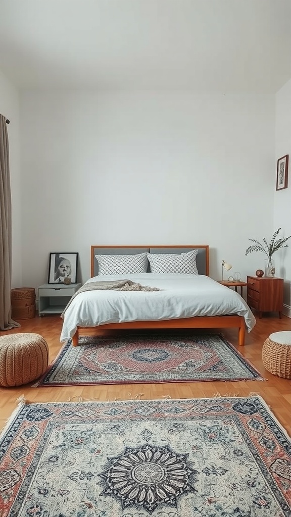 Choosing rugs with different textures can add depth to your room. The braided poufs seen in the image offer a soft, tactile contrast to the more structured shapes of the furniture and bed. This mix of textures is what makes a boho space feel lived-in and inviting.