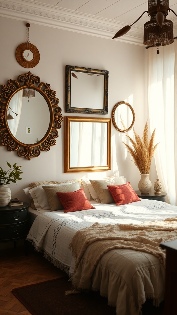 The round and rectangular shapes complement the soft lines of the bed and bedding. With their vintage frames, these mirrors bring warmth to the room, enhancing the bohemian vibe. Natural light streaming through the window reflects beautifully, making the whole space feel bright and airy.